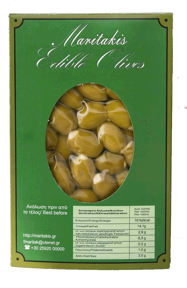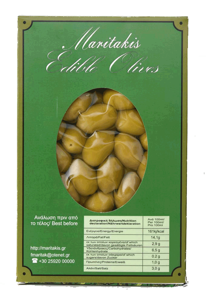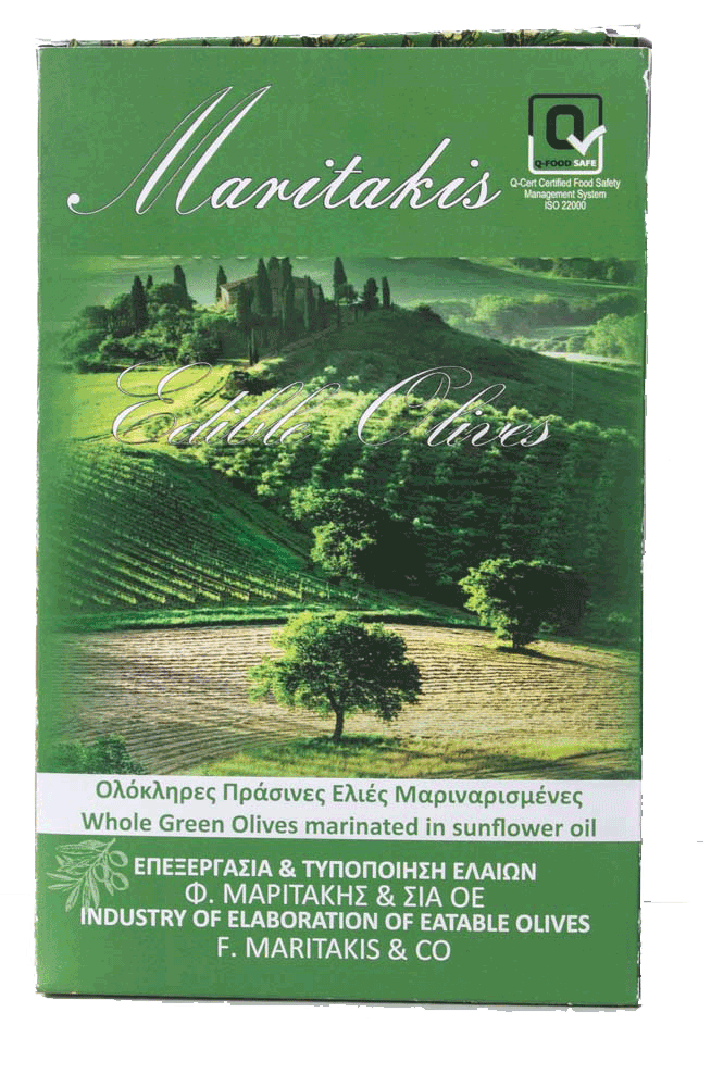 grflagΣυστατικά: Ελιές, άλμη, ηλιέλαιο, αλάτι, σόδα, ρυθμιστής οξύτητας: γαλακτικό οξύ, συντηρητικό: σορβικό οξύ, μέσο οξίνισης: κιτρικό οξύ, αντιοξειδωτικό: ασκορβικό οξύ.